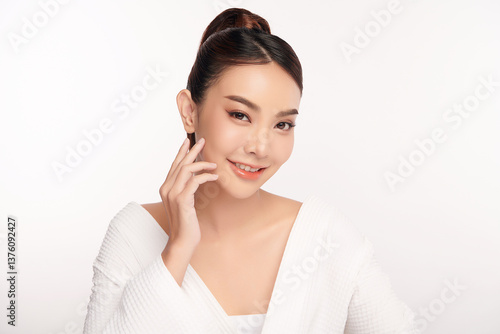 A beautiful young Asian woman with clean, fresh skin against a white background. Skincare, facial treatment, cosmetology, beauty, and spa. An elegant portrait of an Asian woman.