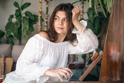 A beautiful young woman plays the old wooden piano.