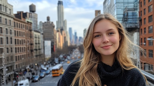 woman, portrait, smile, city, urban, skyline, building, street, architecture, face, expression, happy, hair, blond, pretty, young, outside, daylight, view, background, tree, vehicle, road, travel, lifestyle, bridge, clothes, top, sweater, casual attire, calm, serene, beautiful, person, passenger, traffic, tall, distant, blurred, sky, cloudy, cold, charming, lovely, modern, gold
