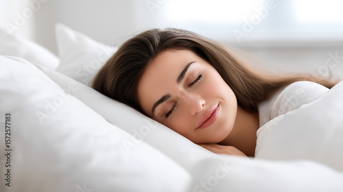 sleep, sleeping, woman, peaceful, serene, calm, restful, bedchamber, bed, pillow, white, comfort, comfortable, rest, relaxation, dreaming, beauty, calmness, wellness, health, lifestyle, quiet, cosy, soft, duvet, blanket, brunette, female, adult, young, person, home, domestic, indoor, morning, night, nap, good, healthy, slumber, to rest, deep, well-being, tranquil, blissful, skin, natural