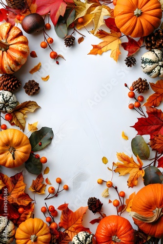 A beautifully arranged autumn-themed frame featuring pumpkins, colorful leaves, and pinecones, perfect for seasonal decorations and marketing materials.