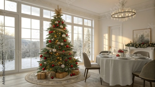 A beautifully arranged Christmas tree fills the center of a bright and airy dining room table, crystal glasses, fine china, sparkling lights