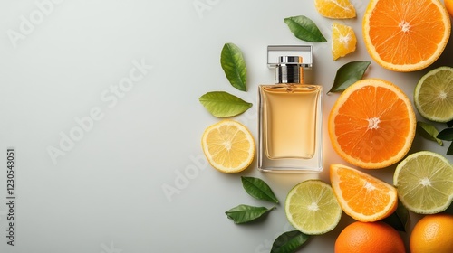 A beautifully arranged citrus perfume bottle amidst vibrant oranges, lemons, and limes, symbolizing freshness and the essence of nature's fragrances.