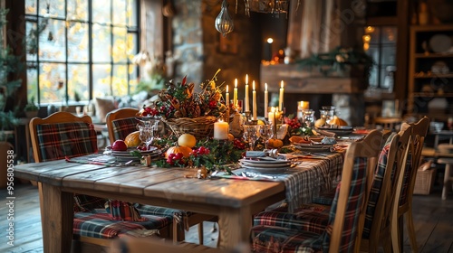 A beautifully arranged dining table with candles, fruits, and autumn decor, perfect for a cozy gathering or festive celebration.