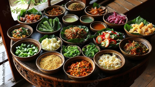A beautifully arranged spread of various bowls on a traditional Thai dining table,