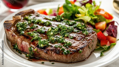 A beautifully arranged steak dinner featuring a thick cut of meat, drizzled with chimichurri sauce, alongside a colorful salad and a glass of red wine, presented on a white tablecloth.
