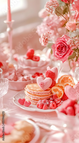 A beautifully arranged table with pink pancakes, fruits, and floral decorations for a celebration.
