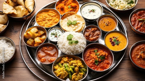 A beautifully arranged thali featuring an assortment of Indian dishes, including curries, rice, and pickles, showcasing the balance and variety in Indian dining.