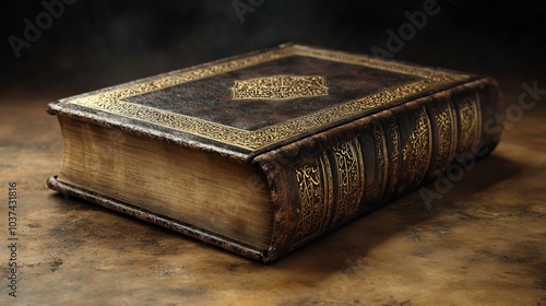 book, leather, ornate, gold, page, antique, literature, history, culture, religion, manuscript, text, binding, cover, decoration, craftsmanship, vintage, library, cognition, wisdom, reading, tradition, heritage, art, design, spirituality, faith, scripture, volume, collection, study, learning, education, symbol, narrative, archive, preservation, exploration, interpretation, insight, journey, storytelling, bequest, inspiration, curiosity