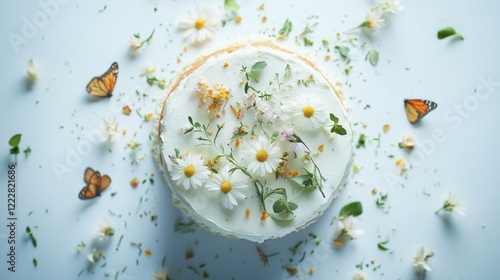 cake, flower, butterfly, decoration, dessert, celebration, nature, spring, freshness, cream, sweet, festive, edible, beauty, garnish, party, layer, tasty, homemade, vibrant, organic, arrangement, herb, daisy, orange, white, green, aesthetic, joyful, colourful, culinary, design, seasonal, artistic, delightful, charming, inviting, delicious, treat, visual, floral, artistry, epicure, indulgence, presentation, creativity, enjoyment