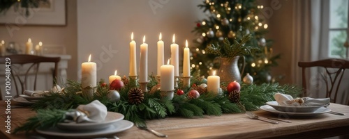 A beautifully decorated Christmas Eve table setting with candles, ornaments, and a vase of evergreen branches, ornate glassware, holiday decor