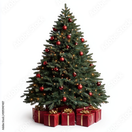 A beautifully decorated Christmas tree adorned with red ornaments and surrounded by gift boxes, creating a festive holiday atmosphere.