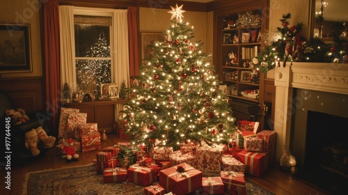 A beautifully decorated Christmas tree adorned with twinkling lights, surrounded by gifts, filling the room with festive warmth and cheer.