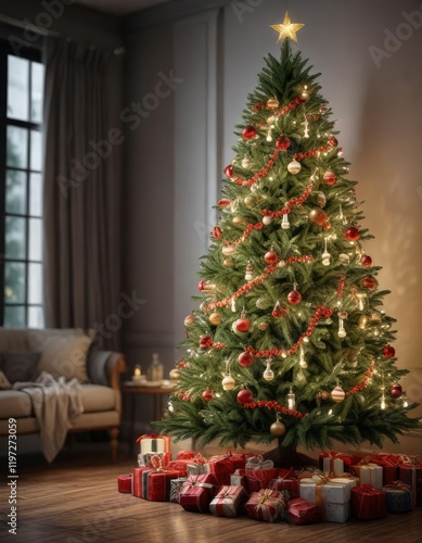 A beautifully decorated Christmas tree with ornaments and garlands , Classic Christmas, Ornaments