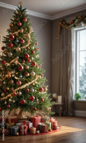 a beautifully decorated Christmas tree with ornaments and garlands, sparkling lights, holiday cheer