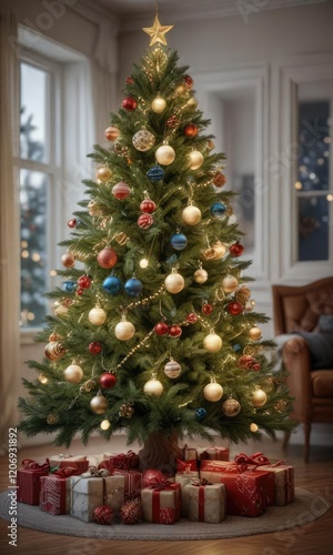 A beautifully decorated Christmas tree with ornaments and lights, festive, christmas tree, evergreen