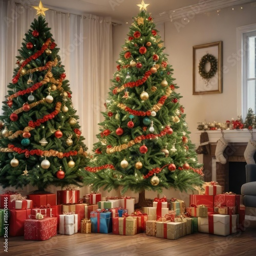 A beautifully decorated Christmas tree with presents and garlands, holiday gift, twinkling lights, cozy atmosphere