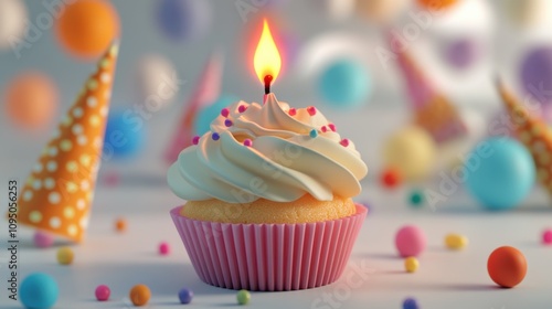 A beautifully decorated cupcake topped with creamy frosting and a lit candle takes center stage among playful party decorations. The atmosphere is vibrant and festive, perfect for a celebration.