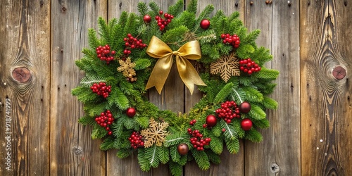 A beautifully decorated evergreen Christmas wreath adorned with sparkling snowflakes, crimson berries, and golden ribbons hangs elegantly on a rustic wooden door.
