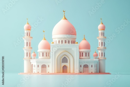 icon, mosque, islamic, muslim, architecture, building, religion, dome, minaret, crescent, gold, pink, white, design, culture, worship, faith, prayer, belief, structure, detail, pattern, ornate, artistic, elegant, modern, style, aesthetic, symbolic, ramadan, eid, festival, celebration, holiday, pastel, turquoise, sky, render, illustration, isolated, concept, decorative, minimal, geometry, soft, clean, shadow