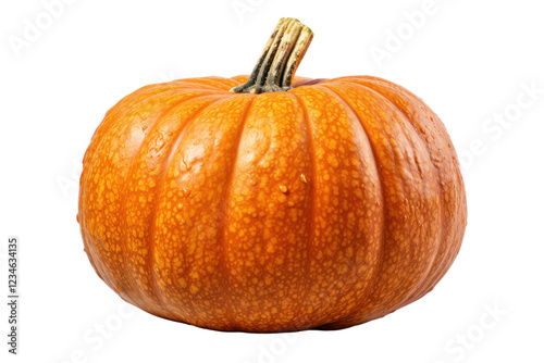 A beautifully detailed pumpkin with a slightly textured skin, showcasing a gradient of orange tones. The stem, thick and robust, stands out against the bright background