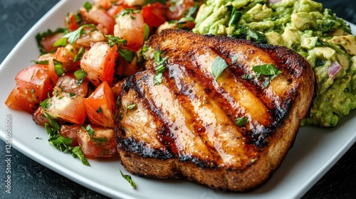 A beautifully grilled chicken breast served with tangy guacamole and fresh tomato salsa garnished with herbs, perfect for a tasty meal or culinary photography.