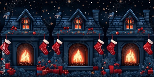 A beautifully illustrated Christmas scene featuring three glowing fireplaces adorned with festive holiday decorations.