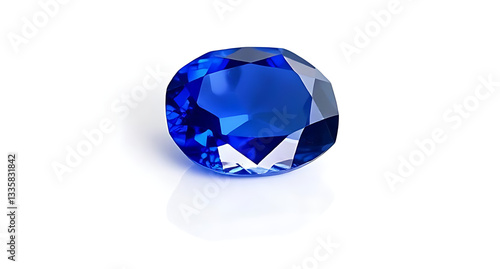 A beautifully lit sapphire stone with a perfect reflective surface, set against a clean white backdrop, ideal for promotional designs
