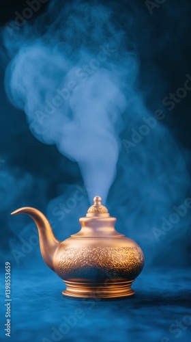A beautifully ornate teapot emits steam against a dark blue backdrop, creating a serene and mystical atmosphere.
