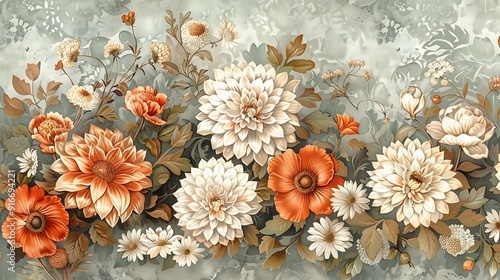 vintage, wallpaper, chrysanthemum, daisy, poppy, hand-drawn, style, classic, bouquet, detailed, line, work, muted, colours, palette, aged, texture, elegant, timeless, experiencing, raw, floral, botanical, illustration, retro, decor, home, interior, decoration, pattern, natural, beauty, nostalgic, charme