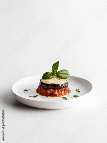 A beautifully plated dish featuring layers of eggplant, cheese, and tomato sauce, garnished with basil.