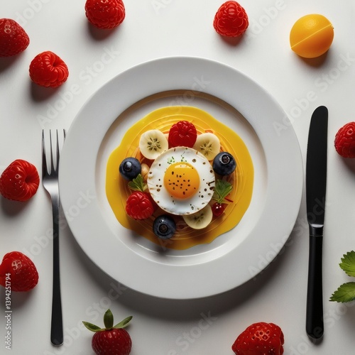 A beautifully plated dish with artistic garnishing on a minimalist white background.