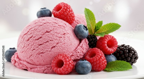 A beautifully plated scoop of berry ice cream, surrounded by raspberries, blackberries, and blueberries.
