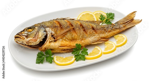 A beautifully presented plate features a crispy, golden fried fish with lemon slices and parsley.