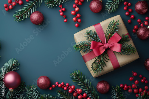 A beautifully wrapped Christmas gift surrounded by pine branches and decorations, set against a blue background.