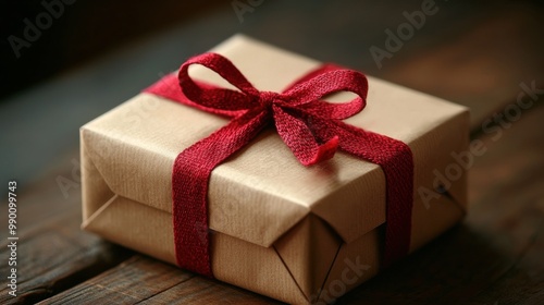 A beautifully wrapped gift box with a red ribbon sits on a rustic wooden surface inviting curiosity and anticipation