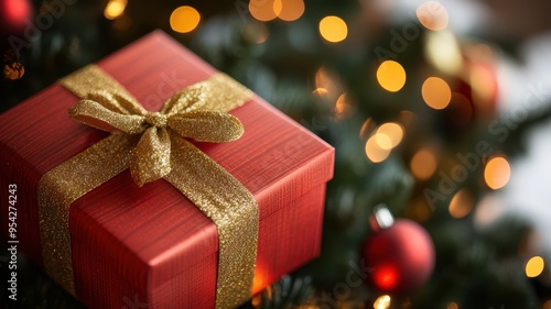 A beautifully wrapped red Christmas gift sits amidst twinkling lights, perfect for holiday celebrations and festive decorations.