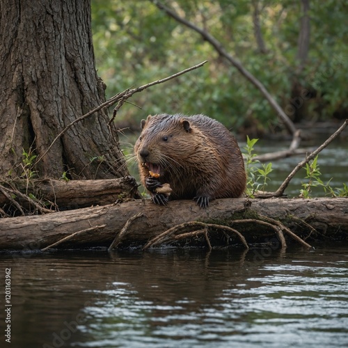 A beaver building a dam near a tree-lined stream.A beaver building a dam in a calm forest stream.A baby beaver building a small dam.