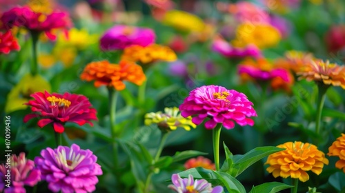 A bed of zinnias blooms in a riot of colors, their sturdy stems and long-lasting flowers making them a garden favorite.