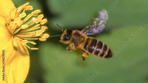 A Bee hovering while collecting pollen from blossom. Hairs on Bee are covered in yellow pollen as are it's legs.