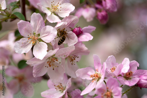 A bee on the blossoming buds of an apple tree. Background with place for text