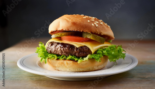 A beef burger with a juicy patty, melted cheese, lettuce, tomato, pickles, and a toasted bun, styled on a light plate. Perfect for fast food visuals, casual dining, or gourmet burger themes