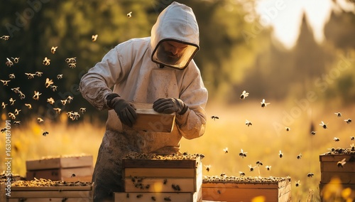 A beekeeper inspects hives in a golden field at sunset, surrounded by busy bees gathering pollen