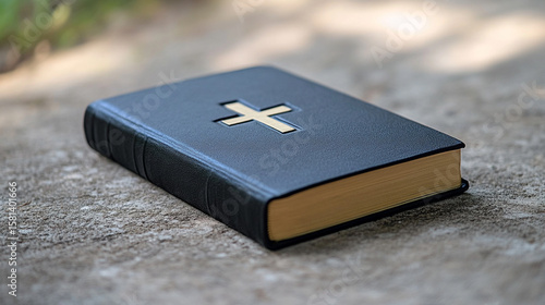 A Bible with a prominent cross on its cover, placed against a clean background with space for captioning on the side. Symbolizing faith, devotion, and Christian values in a minimalist setting.