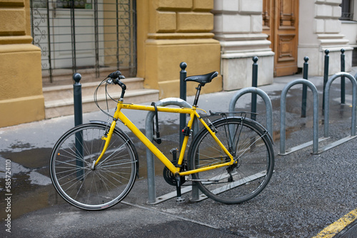 A bicycle parked on the street. Bike parking. Eco green city. Bike theft problem. minimizing carbon footprint.