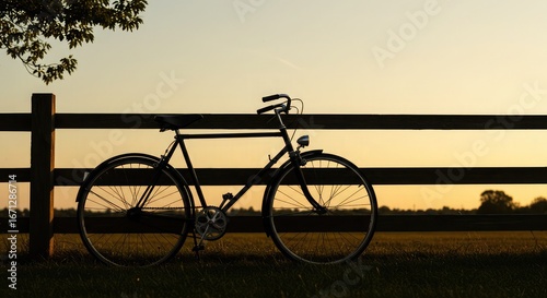 bicycle, silhouette, fence, sunset, field, grass, sky, evening, nature, landscape, sun, light, shadow, horizon, tree, wooden, structure, transportation, ride, vintage, retro, classic, wheel, frame, handlebar, seat, pedal, tire, spoke, rim, chain, gear, brake, bell, lamp, peaceful, calm, serene