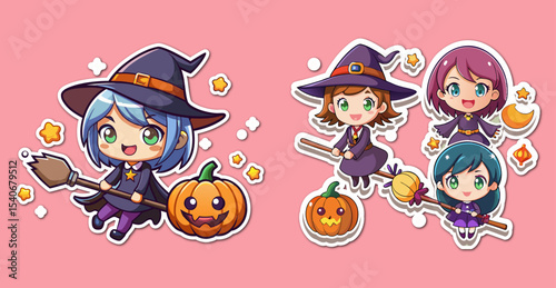 A big bundle of Chibi style sticker Little girl witch with a kitten flying on a broom.