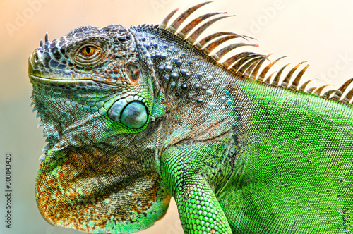 A big iguana lizard on green background.