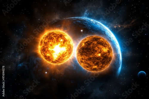 A binary star system, with two stars orbiting each other and their combined light illuminating nearby planets