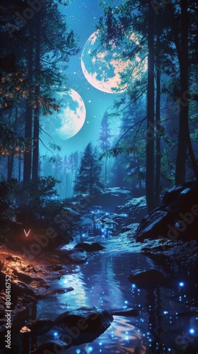 A bioluminescent forest bathed in the soft light of two moons, creating an enchanting and otherworldly scene Render in a 3D illustration with a focus on celestial bodies